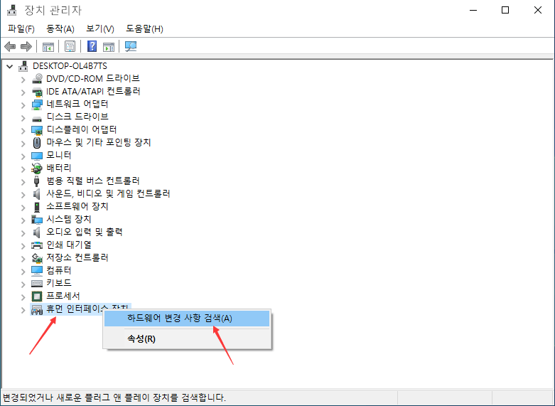 5 단계. 제거 후 하드웨어 변경 사항 검색 옵션을 누르십시오.